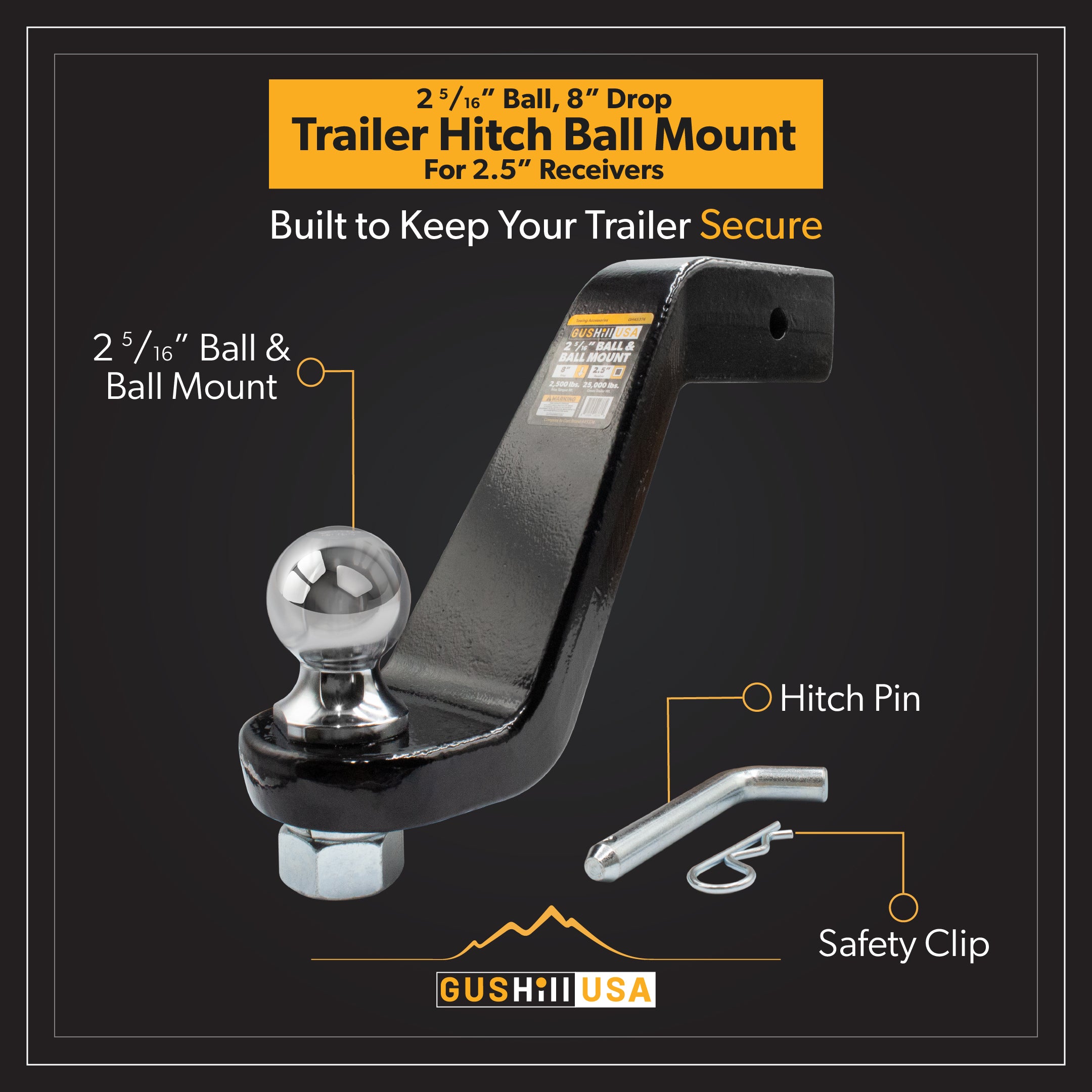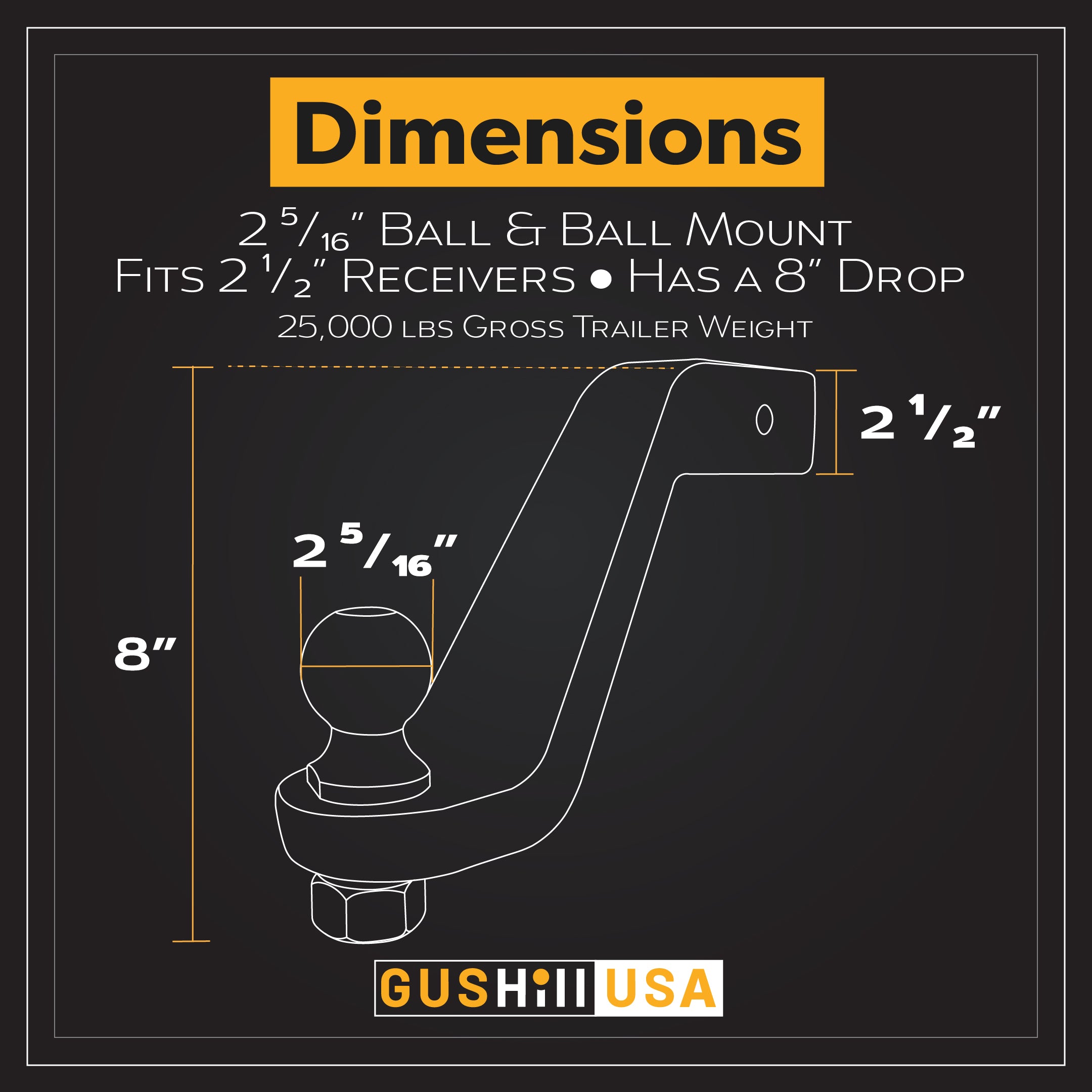 Introducing our ball mount for 2.5" receivers, featuring a 8" drop and a 25,000 lbs tow rating. For added security, we've included 1 non-locking pin and clip. Get ready for a seamless towing experience.