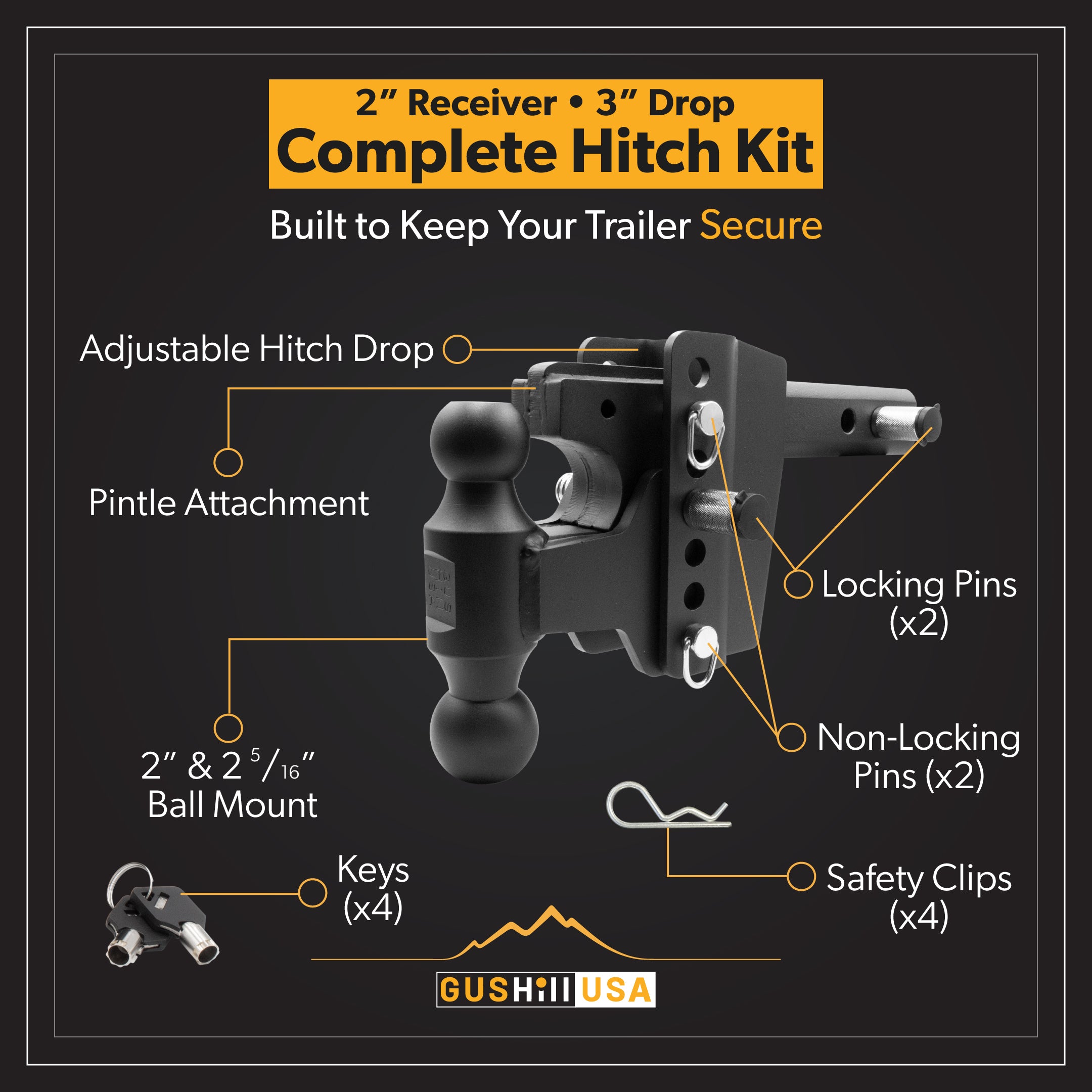Introducing our complete hitch kit for 2" receivers, featuring a 3" drop and an impressive 16,000 lbs tow rating. This kit includes a dual-size ball mount (2" & 2-5/16"), as well as a pintle attachment. For added security, we've included 2 locking pins that are keyed alike, along with 2 non-locking pins. Get ready for a seamless towing experience with our comprehensive hitch kit.