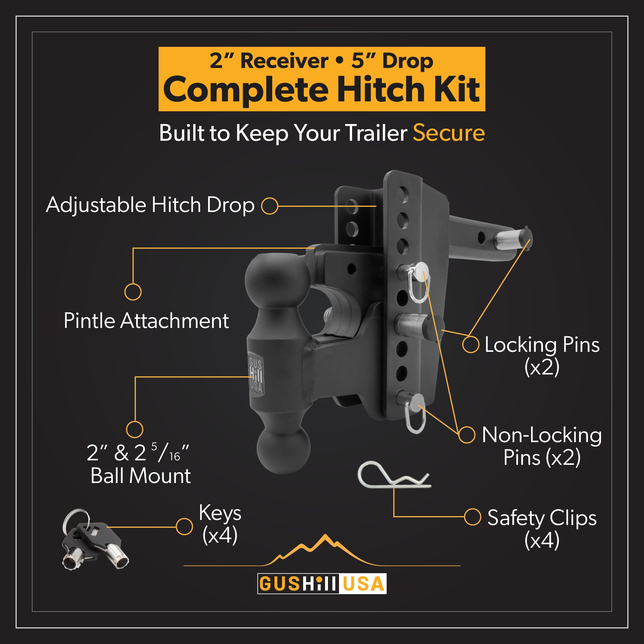Introducing our Complete Hitch Kit for 2" receivers, featuring a 5" drop and a 16,000 lbs max tow rating. This kit includes a pintle attachment to ensure the ultimate versatility. For added security, we've included 2 locking pins and 2 non-locking pins with safety clips. Get ready for a seamless towing experience.