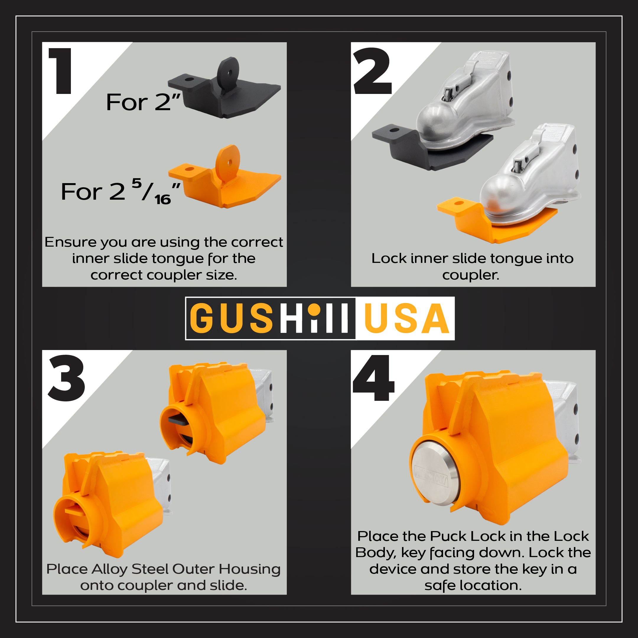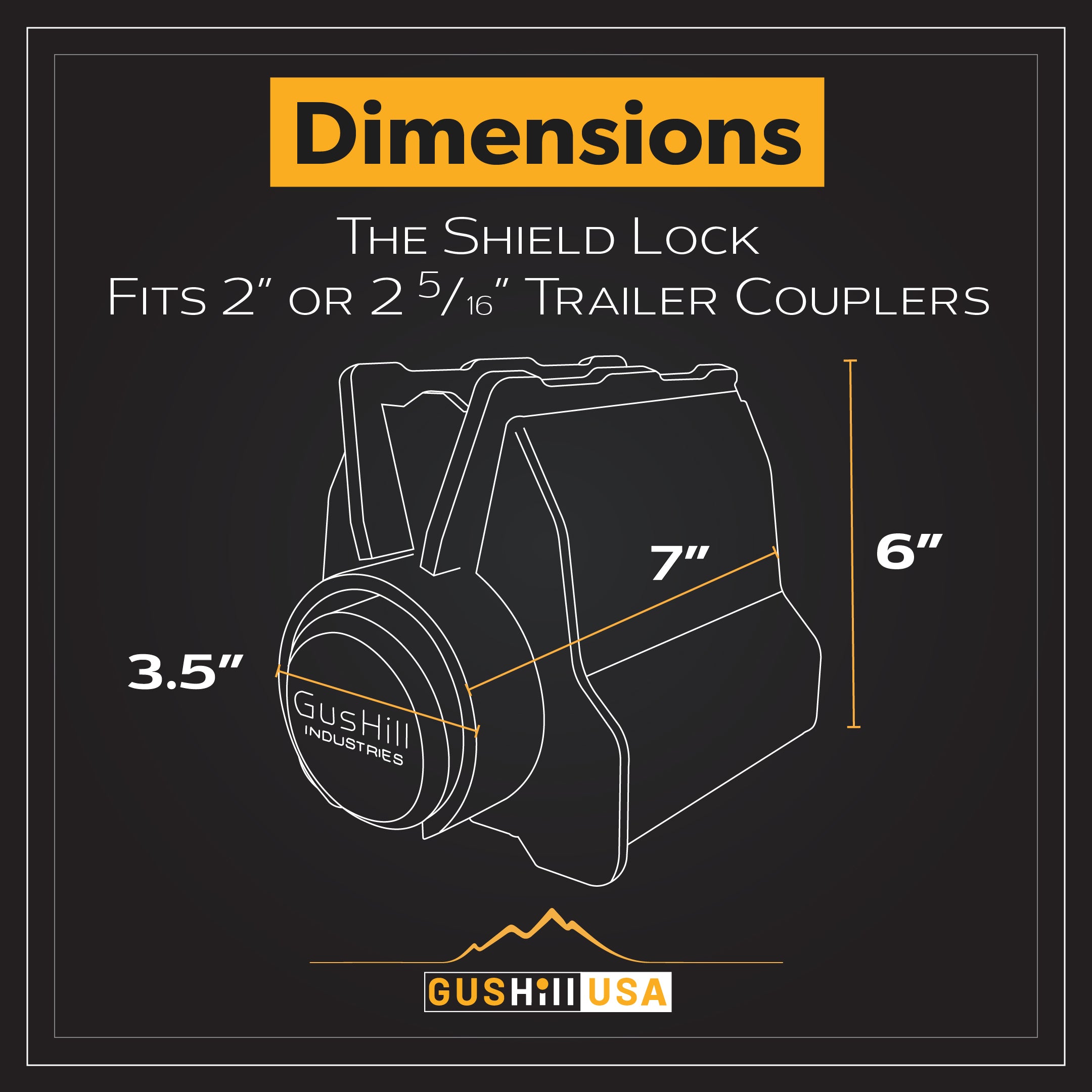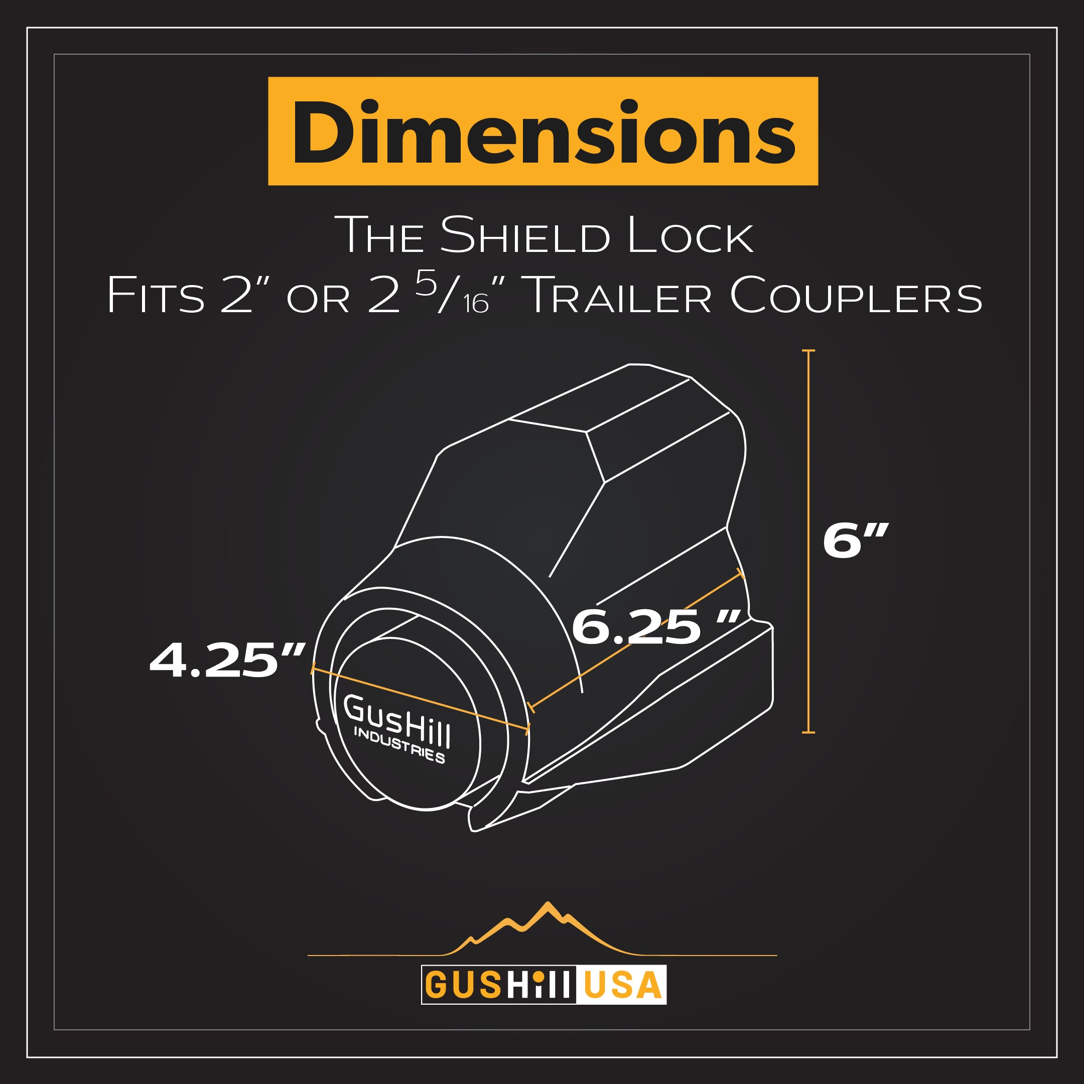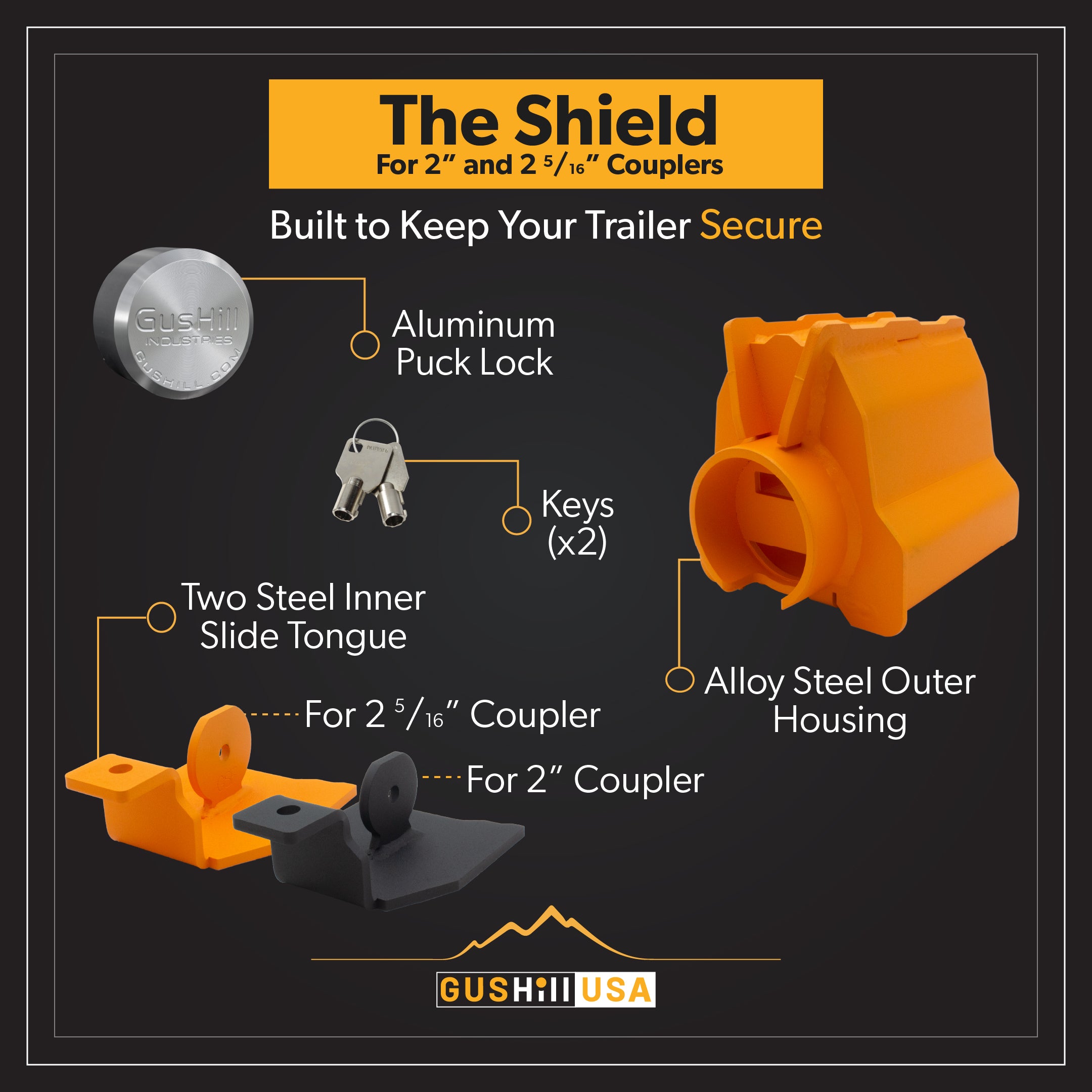 The Shield lock is one of GusHill’s patented innovations in trailer security. It was designed to fit a broad array of common trailer couplers, in both 2" and 2-5/16" sizes. This lock is made of high strength, lightweight 713 Tenzaloy aluminum.